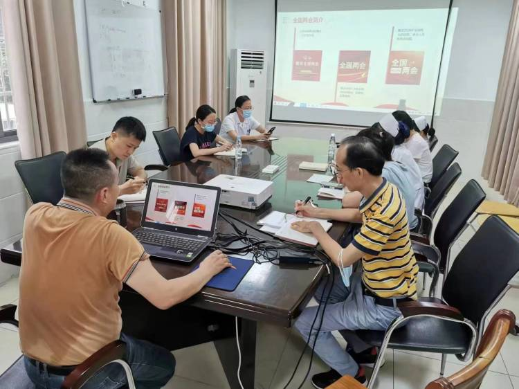 在支部书记的带领下,支部党员认真听取两会精神的重要内容,做好会议记录。